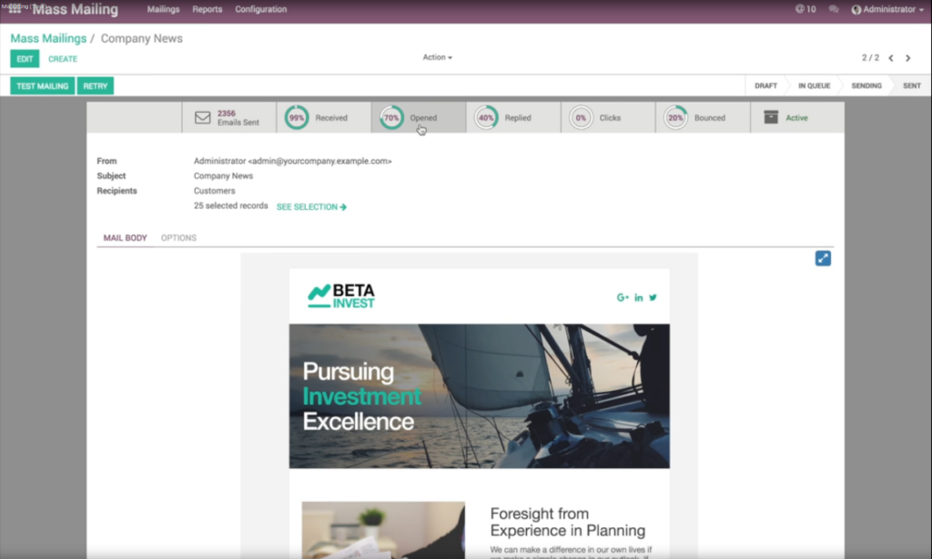Email Marketing made easy. Build awesome campaigns. Get accurate and real-time statistics on every email sent out. Easily track your open rate, bounce rate, click-through rate and improve your overall marketing strategy. Follow the opportunities generated and track the expected revenues.